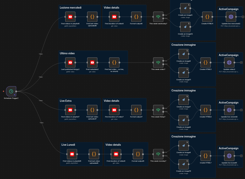 channel’s latest uploads, and writes them into an ActiveCampaign template that exposes HTML variables updated via HTTP calls, with